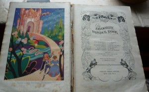 When Rhoda asked me to nominate a special book that I had inherited, I went back to the bookshelf to see which one had inspired me most and the truth is, they all did, but there is one that is quite special, and Rhoda, I hope you don’t think I am cheating but I have decided to nominate a compendium. It is called The Favourite Wonder Book, and is full of stories and poems by such great authors as P G Wodehouse, A A Milne, Eleanor Farjeon, E Nesbit, Alexander Dumas, Oscar Wilde, Leo Tolstoy and many, many more. The date in this book is 1938 and my father bought it long before I was even a twinkle in his eye! I think it must have been bought for the eldest of my three brothers, who was born around then. It is quite a heavy volume with a beautiful blue cover of embossed leather and I always thought it very special. In those between-the-war days when this books was published there was no TV to speak of and very few books had illustrations – this one has over 300, but tellingly only 5 of them are in colour.