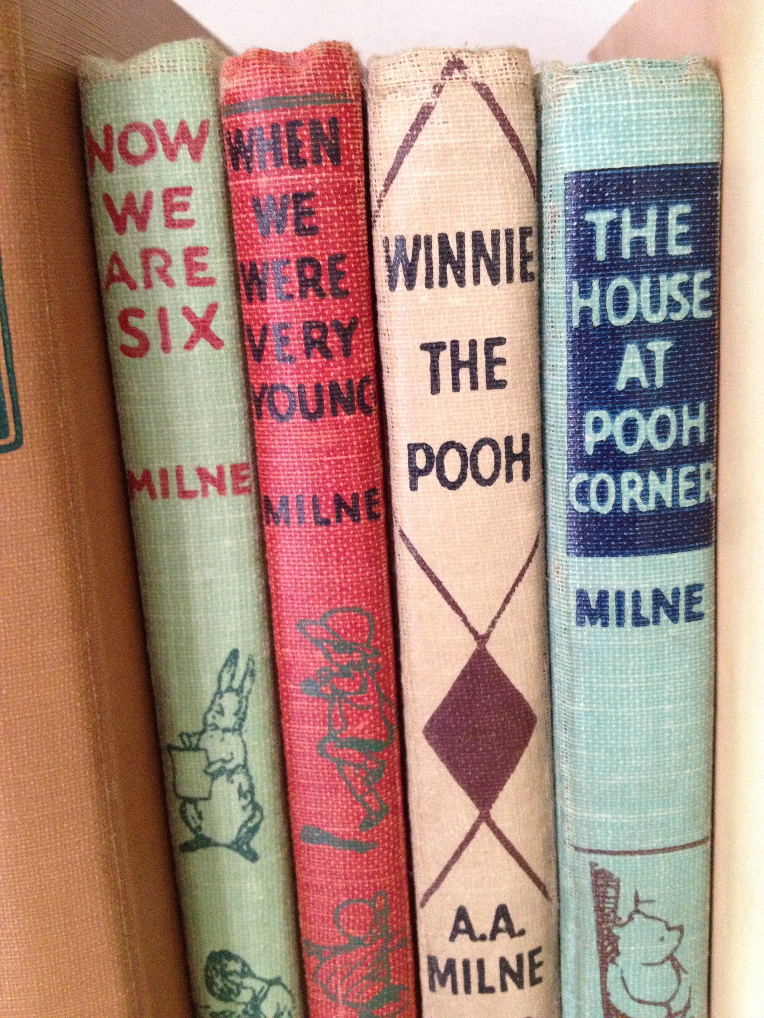 I have a set of four pooh books from my childhood (Winner the Pooh, The House at Pooh Corner, When We Were Very Young and Now we are Six). These particular editions were reprinted in 1959. The year I was born. The origin of the books is lost in time. But from a very early age I remember my mother reading to me from them. I can feel the warmth from cuddling close, the sound of her voice echoing up through her chest, the smell of her perfume surrounding me like a favorite blanket.