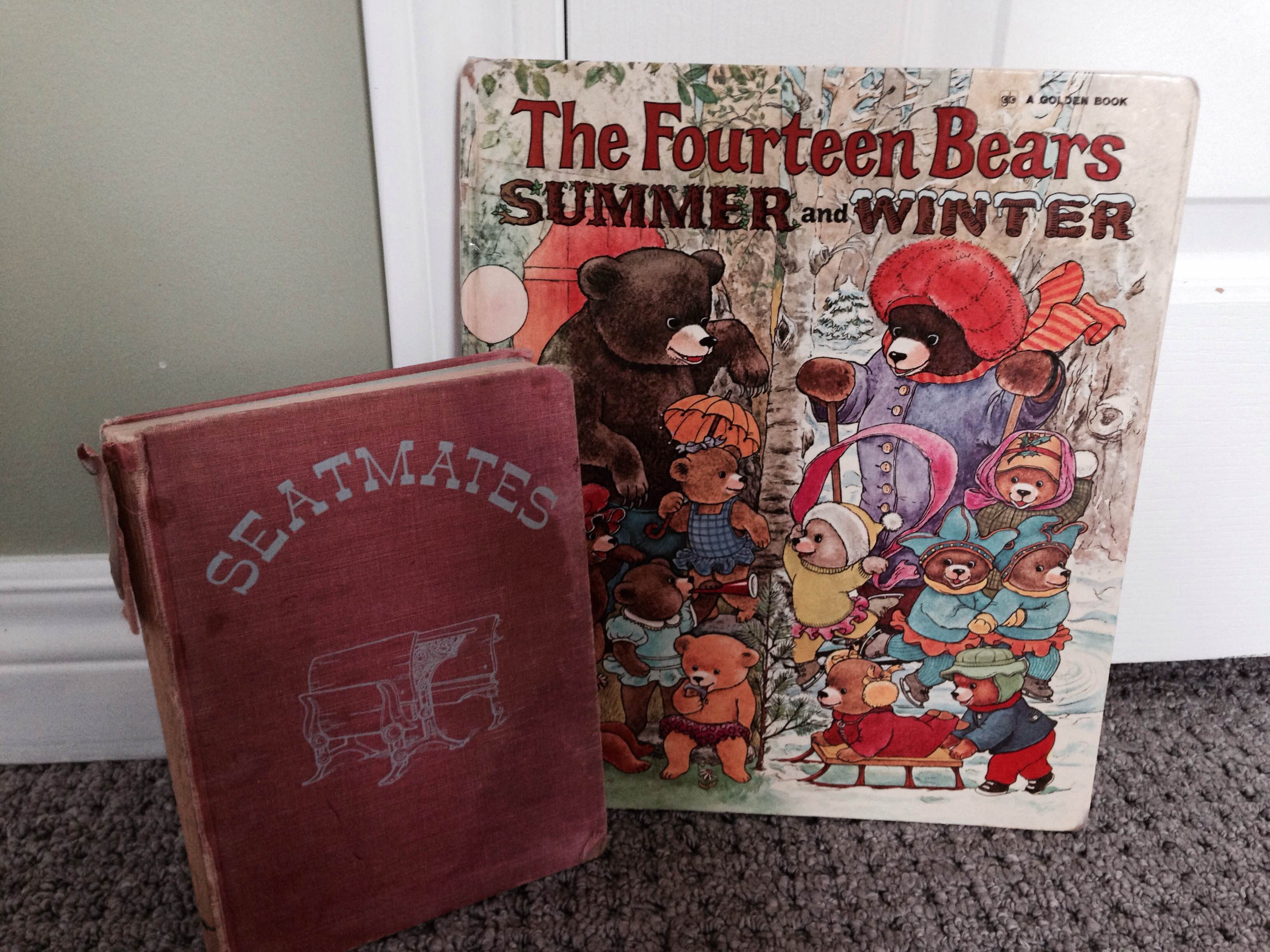 I am unsentimental about objects and virtually all my reading these days is in ebook format, so I’m afraid I don’t have much that’s heirloom-worthy. I will, of course, pass down Seatmates. I’m also reading a book to my son that came from my childhood—The Fourteen Bears in Summer and Winter (1969), by Evelyn Scott. As you might imagine, it’s a story about fourteen bears. They have the usual bear-ish summertime adventures involving honey farming and swimming in the pond. Hibernation would seem to put an end to all this fun, but not for our bears! The baby of the family wakes up one winter day (so what they’re saying is this whole non-sleeping baby thing is an interspecies truth?), so the whole clan bundles up and heads out to experience winter. It’s a charming book full of details: each bear has her own house furnished to reflect her personality and decorates her own tree for Christmas. It’s been a hoot to watch my son take it all in.